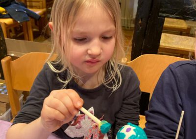 Bekanntermaßen macht Basteln hungrig und so wurde natürlich auch für das leibliche Wohl gesorgt. Die Kleinen griffen beherzt zu Schoko-Osterhasen und Apfelsaft, während sich die Eltern bei Kaffee und Keksen in einer entspannten Atmosphäre austauschten. Das Interesse an den nächsten Kinderveranstaltungen war groß und einige Eltern fragten bereits, ob wir das Osterbasteln im nächsten Jahr wiederholen. Dieses positive Feedback hat uns außerordentlich gefreut, insbesondere da es unsere erste Mitmachaktion für Kinder war.