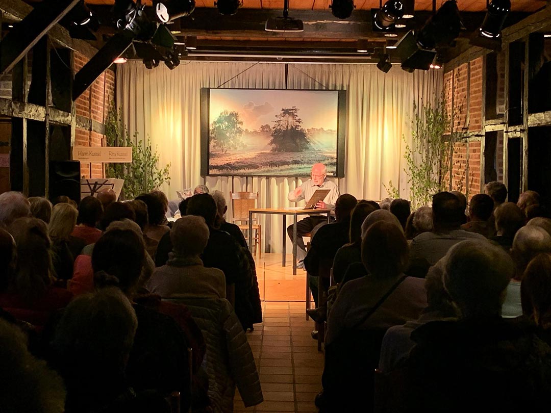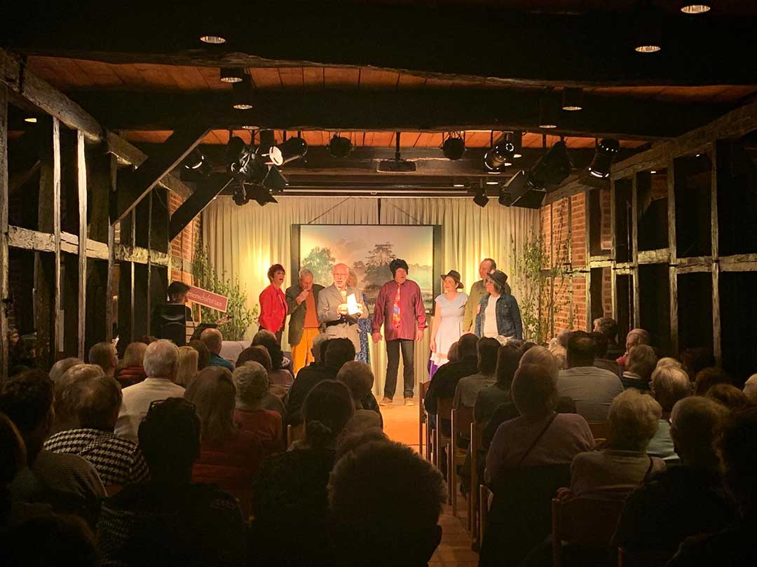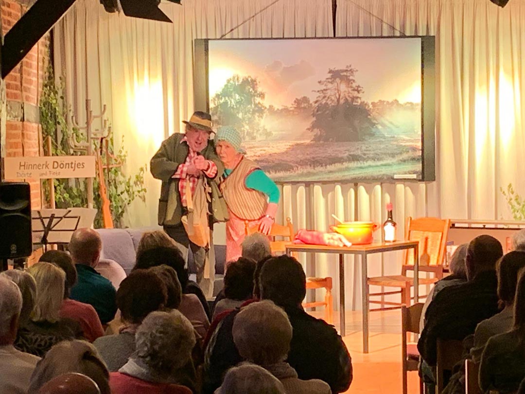 Bei der Begrüßung ich fest, dass die anwesenden Gäste eigentlich zu beglückwünschen seien ! Die Karten waren nämlich sehr schnell vergriffen, und es bestand für diesen Abend keine Möglichkeit für ein paar seitliche Stühle oder für Stehplätze. Die „Steenbeeker“ hatten für dieses einzigartige plattdeutsche Musical den stimmgewaltigen Chor „pur calluna“ aus Marxen mit dabei. Und der Chor hat 35 Sänger und Sängerinnen! Das Makens Huus war damit rappelvoll, und die Mannschaft vom Bürger und KulturForum hatte vor, während und nach der Aufführung gut zu tun ! Aber es klappte alles bestens.